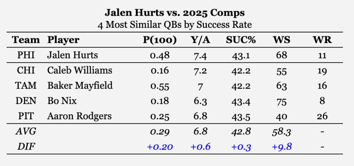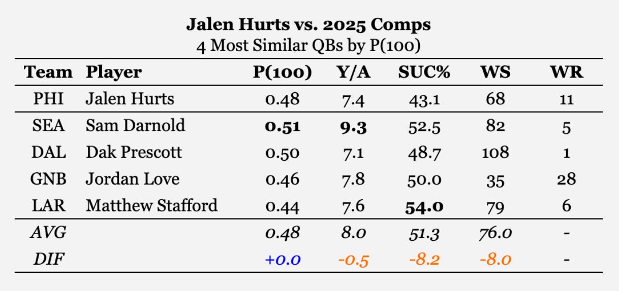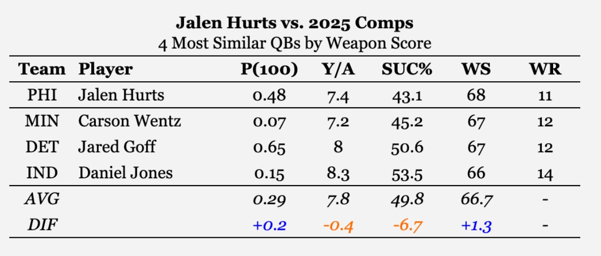 Hurts has a worse success rate and lower yards per attempt than those quarterbacks with a similar P(100) – but he is also working with worse weapons. In particular, Darnold, Stafford, and Prescott all have much better weapons.