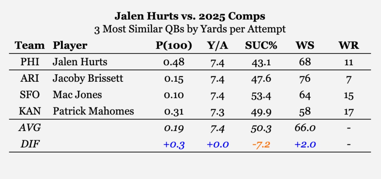 But when we compare Hurts to this cohort, he does much, much better. He is 20 percentage points more likely to average a QB rating of 100 over four games, he averages more than a half a yard more per attempt.