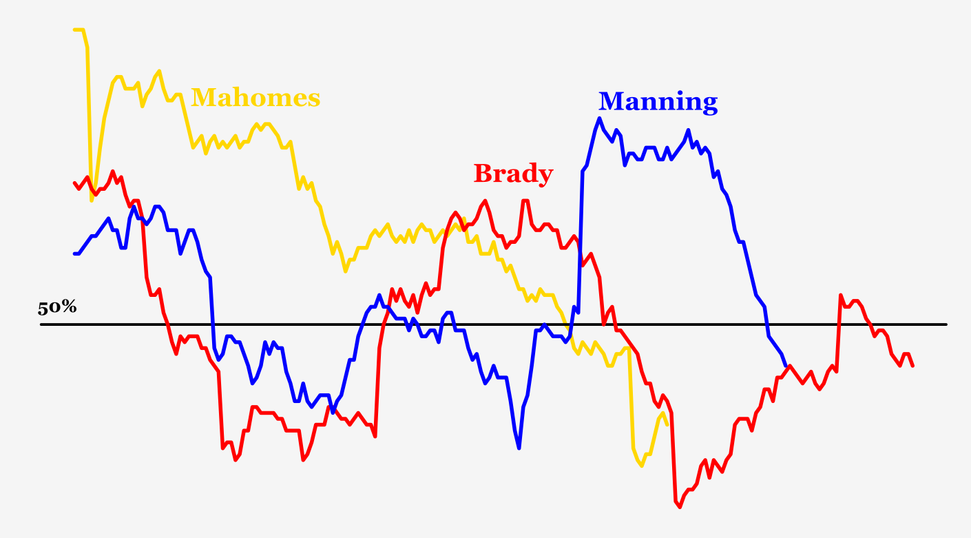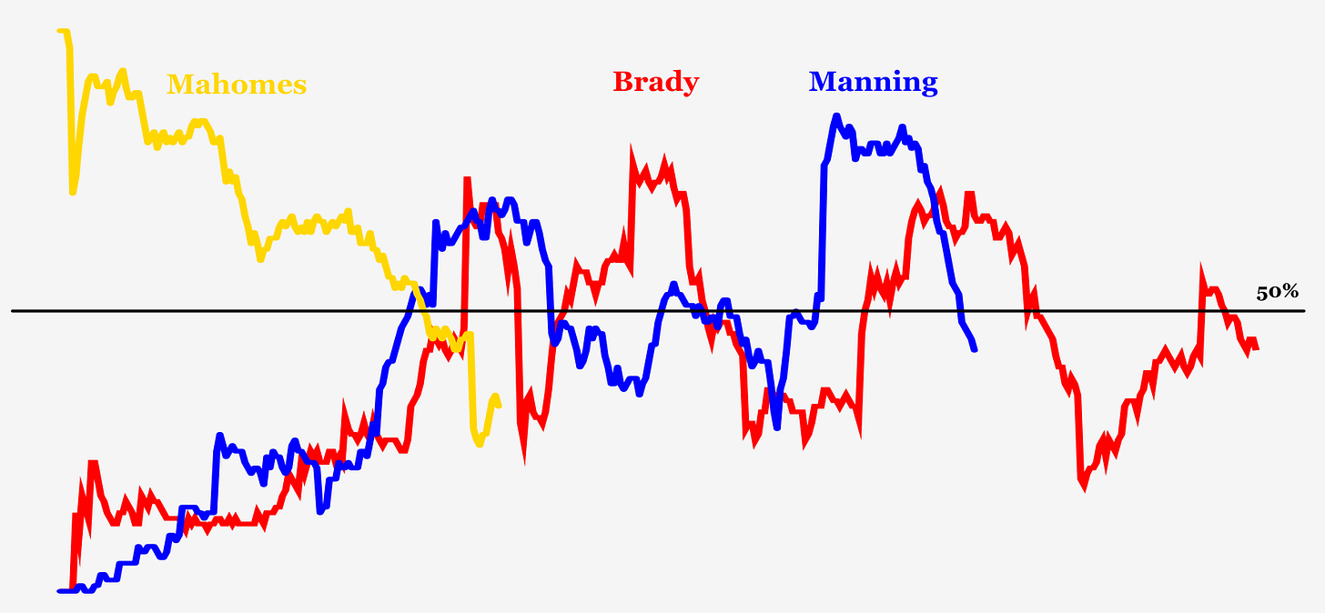 It’s worth remembering that these dips from Brady and Manning are also between seasons 8 and 12. So you’re seeing accumulated injuries, coach turnover, and the general aging out of their primes. Both Brady and Manning had to learn new ways to play as they aged. Mahomes, turning 30 this year, is at the tail end of his prime and presumably has not had that dip yet.