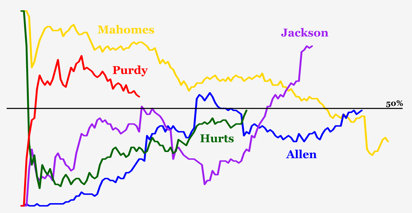 Black horizontal line is 50% – the P(100) benchmark for elite QB play.