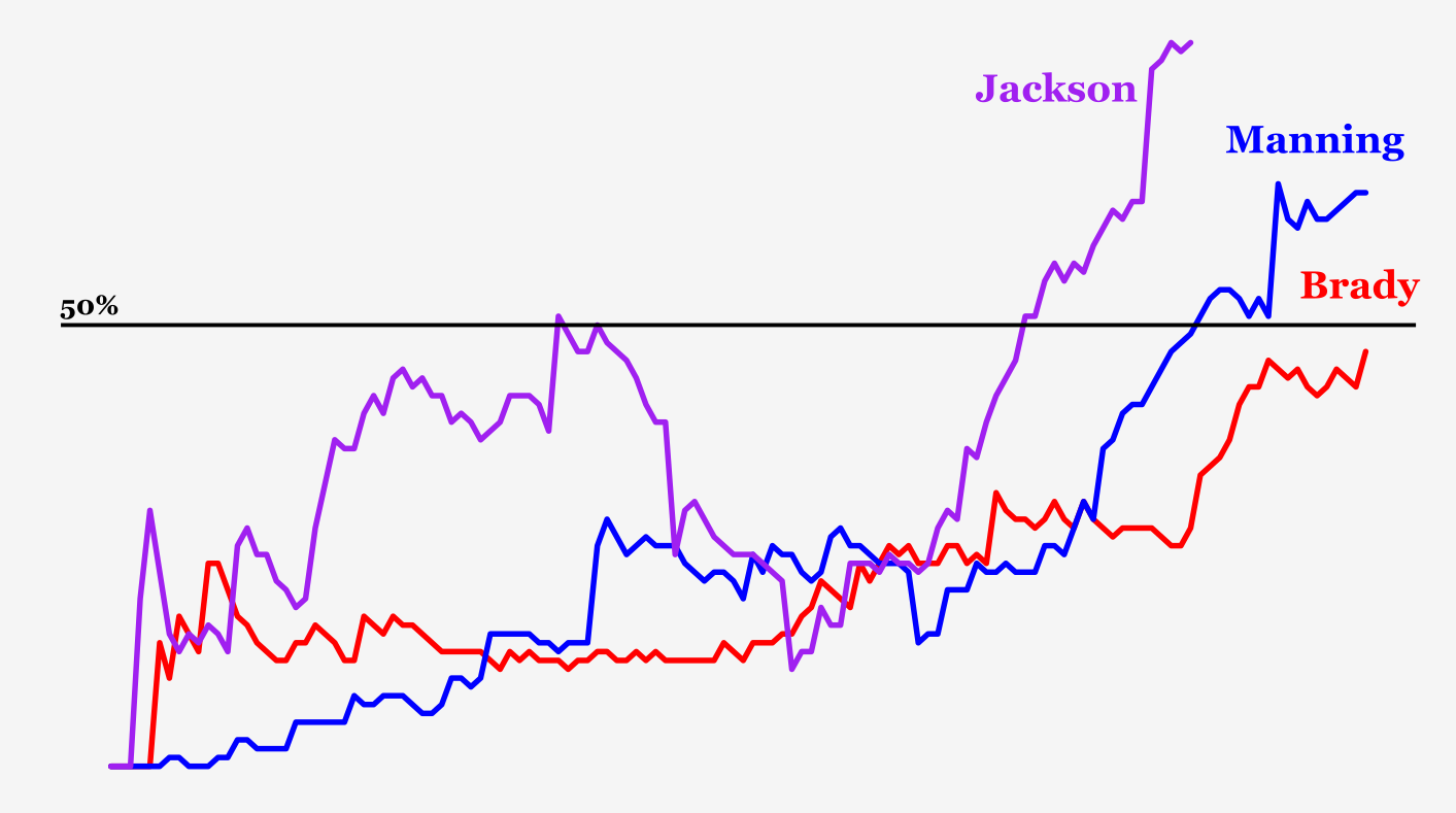 Jackson, actually compares favorably to both Brady and Manning for the first 110 games of his career. This stretch of games from 80 to 130 or so is when both Brady and Manning found their first peak. And Jackson is hitting his stride around the same time.
